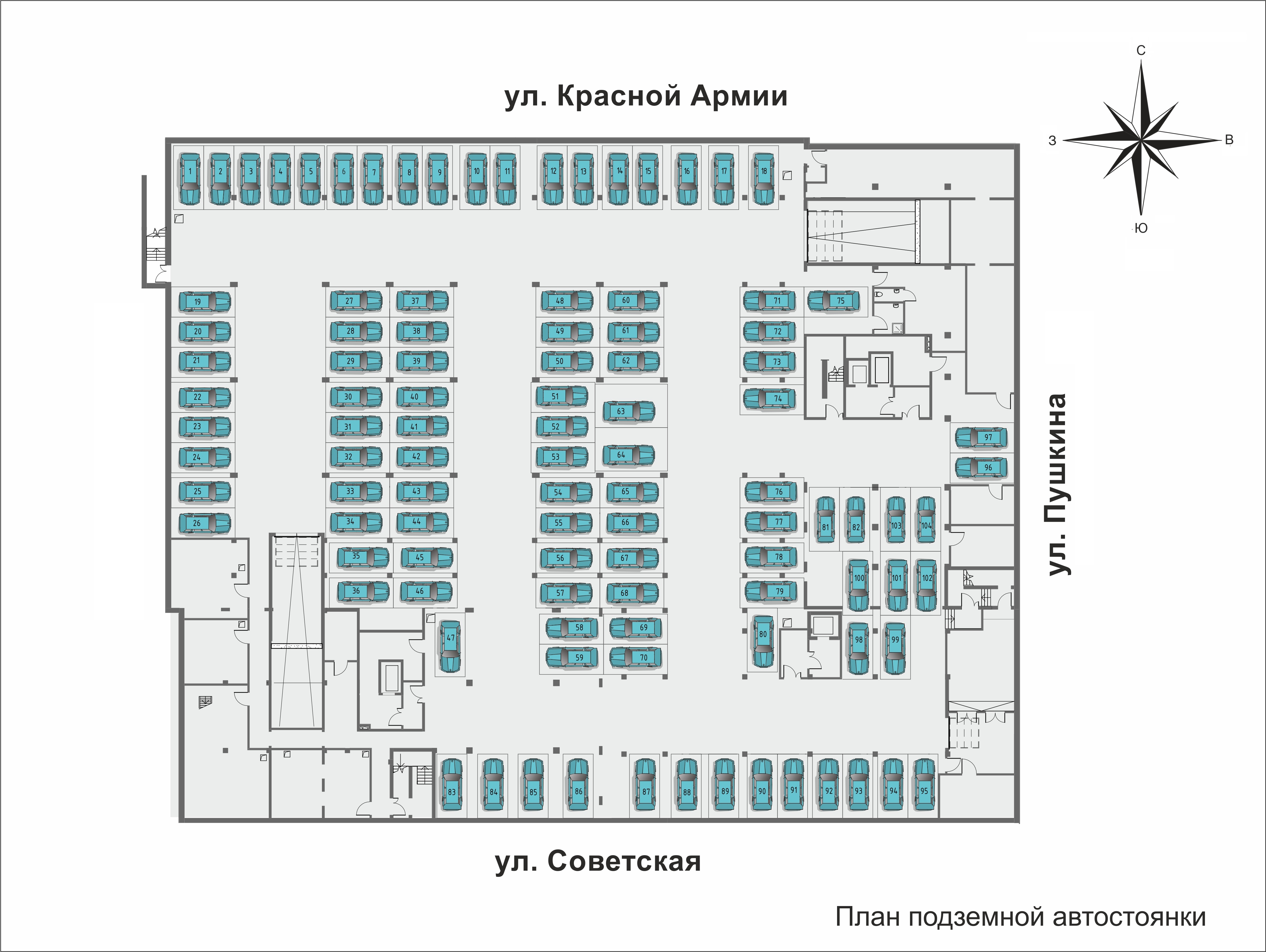 Парковка рассчитана на 104 автомобиля.